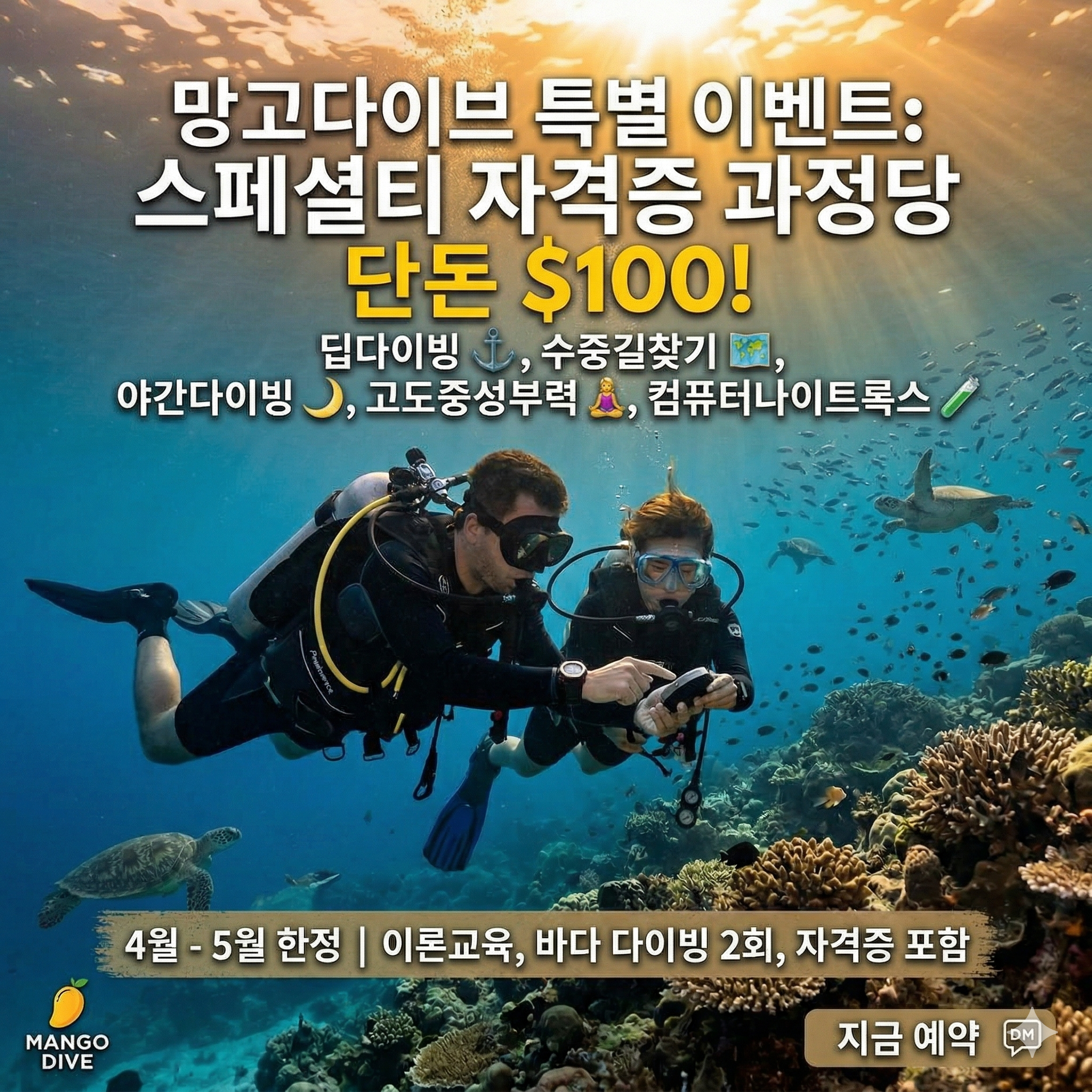 "핀 하나를 차는 각도, 산호를 대하는 매너, 철저한 매뉴얼 준수. 망고다이브가 강조하는 이 작은 디테일들이 모여 당신의 다이빙을 명품으로 만듭니다. 우리는 사진 한 장을 찍더라도 다이버의 품격이 느껴지도록, 기본과 원칙 위에서 가장 아름다운 순간을 기록합니다."